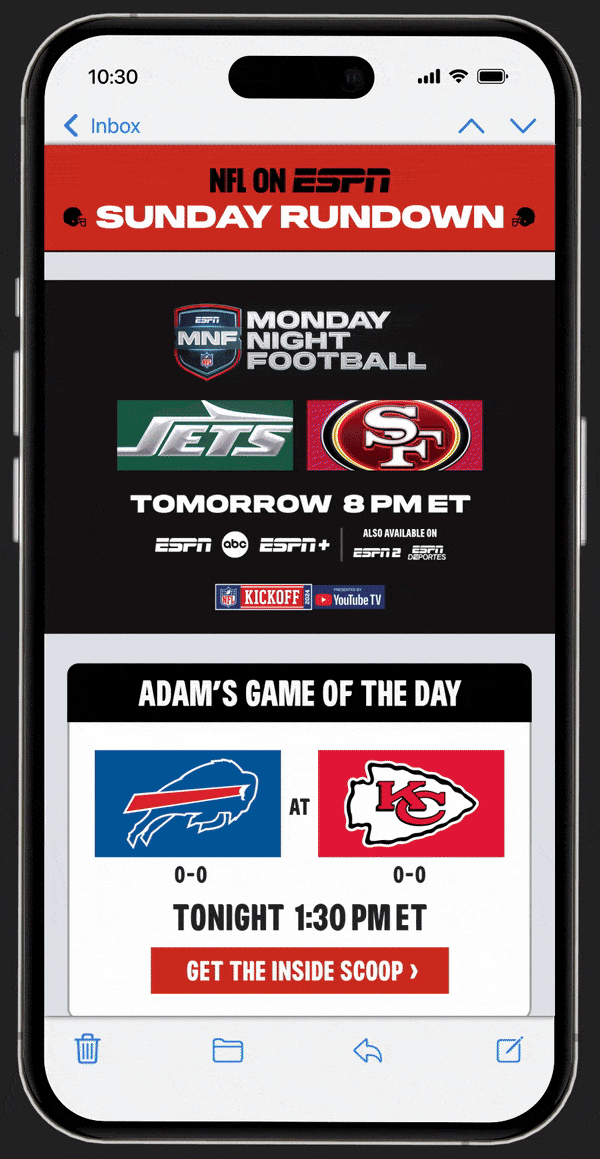 As one of ESPN’s flagship properties, I was responsible for helping to elevate the NFL brand throughout the season via multiple digital platforms. This included automated display banners, dynamic Sunday and Monday email campaigns, off-channel ads, microsites, and more.